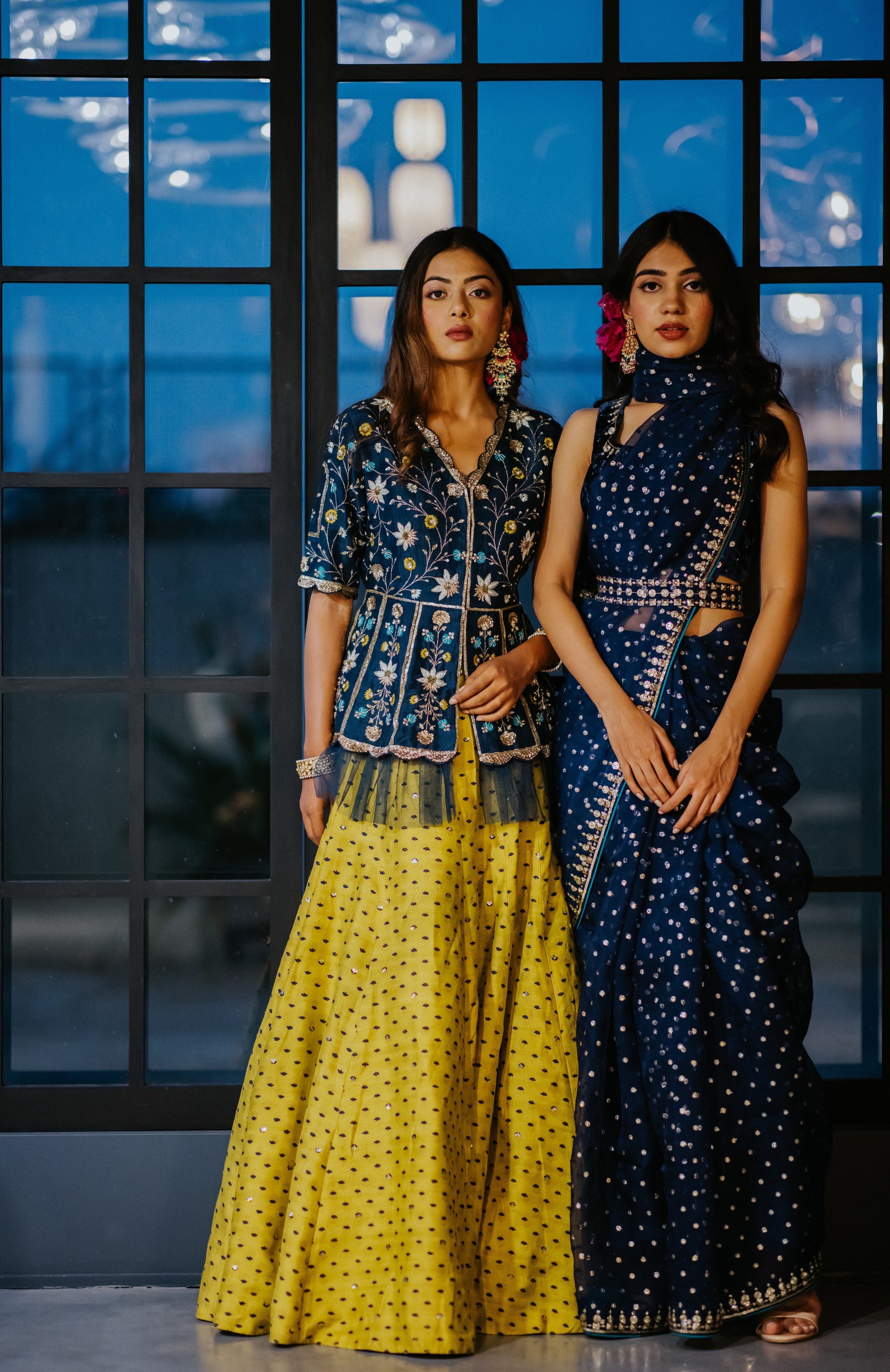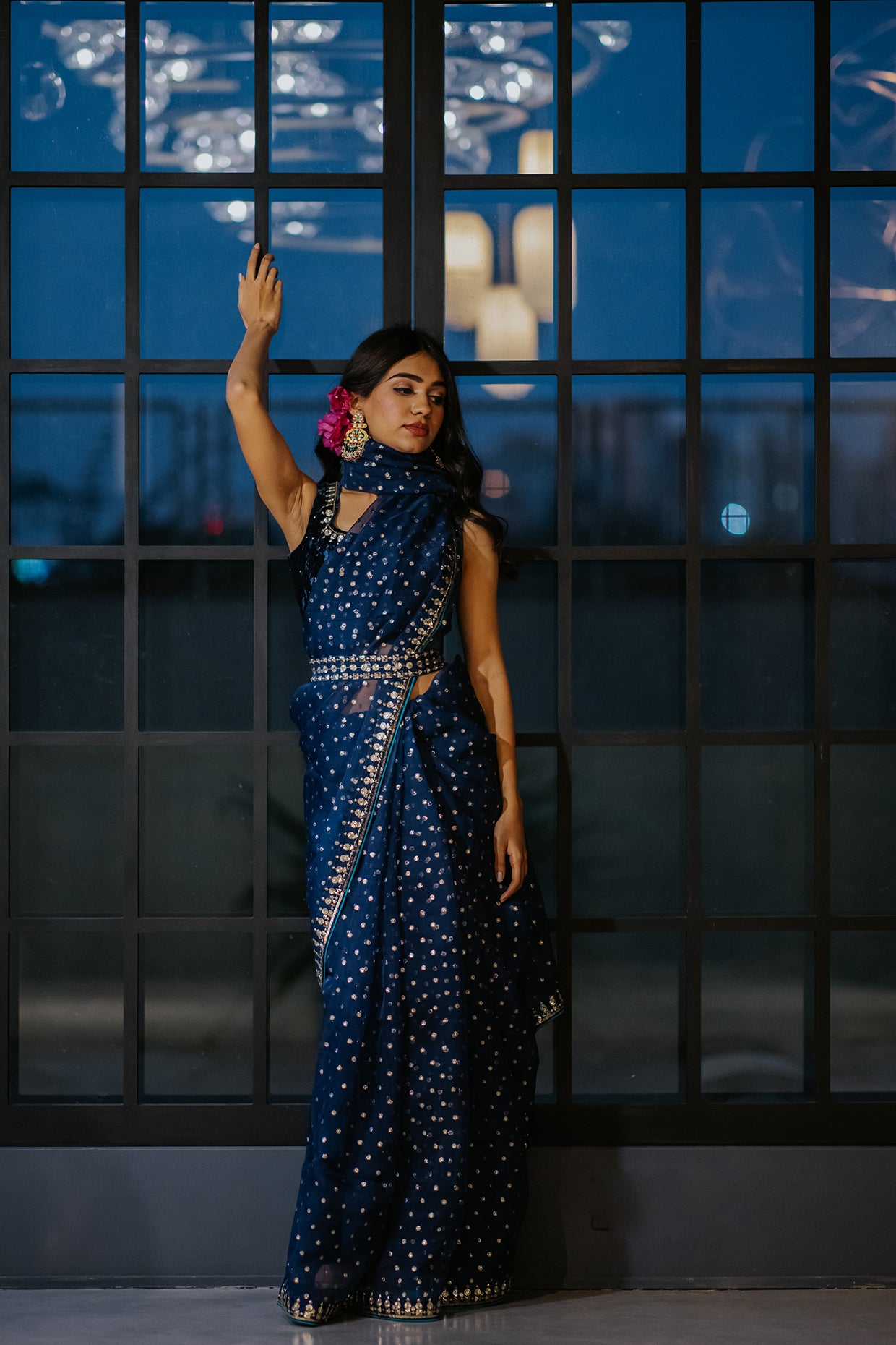 Featuring an indigo silk organza saree with woven zari booti all over and sequins embroidered border on all sides paired with a matching silk velvet blouse with elbow length sleeves. It comes with an indigo shantoon petticoat skirt and an embroidered belt.