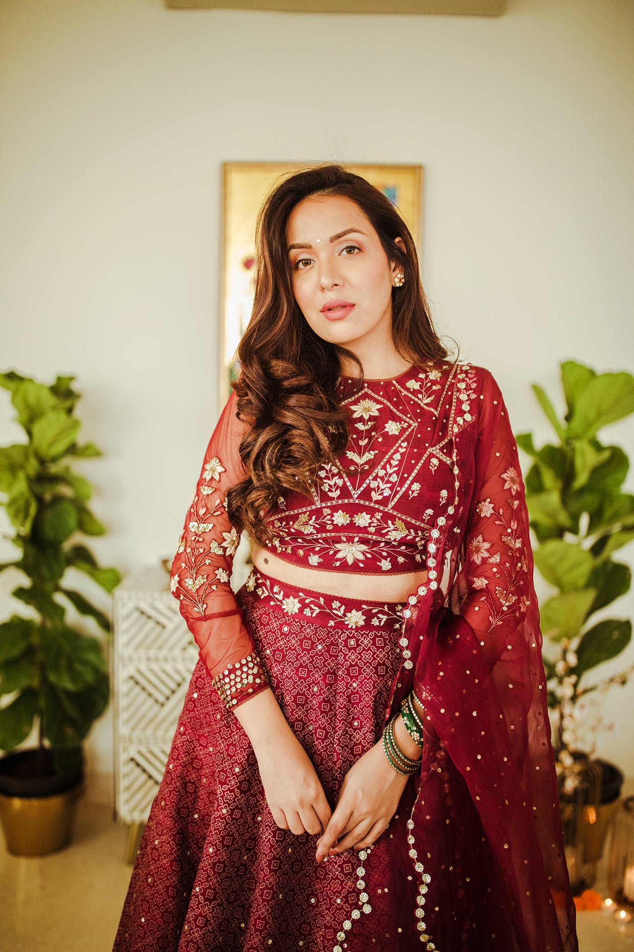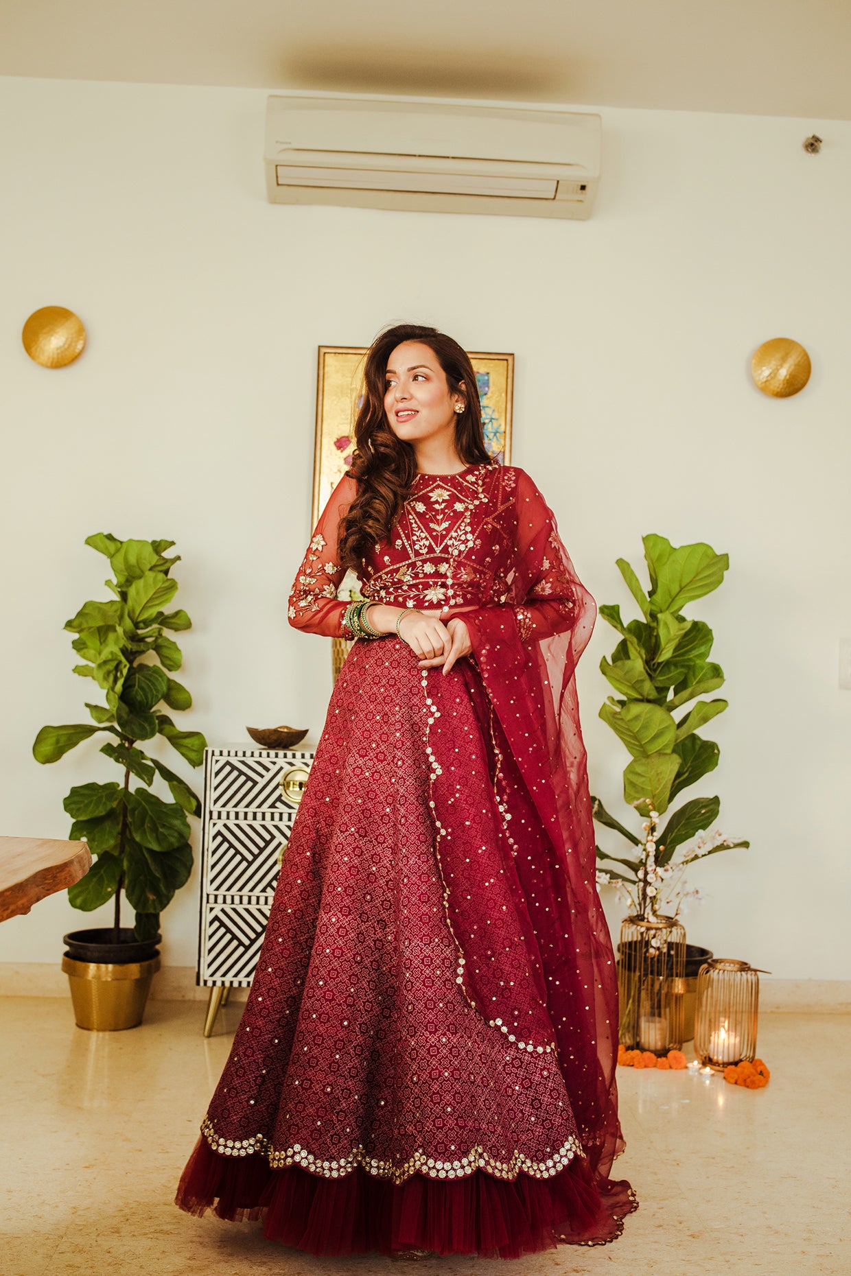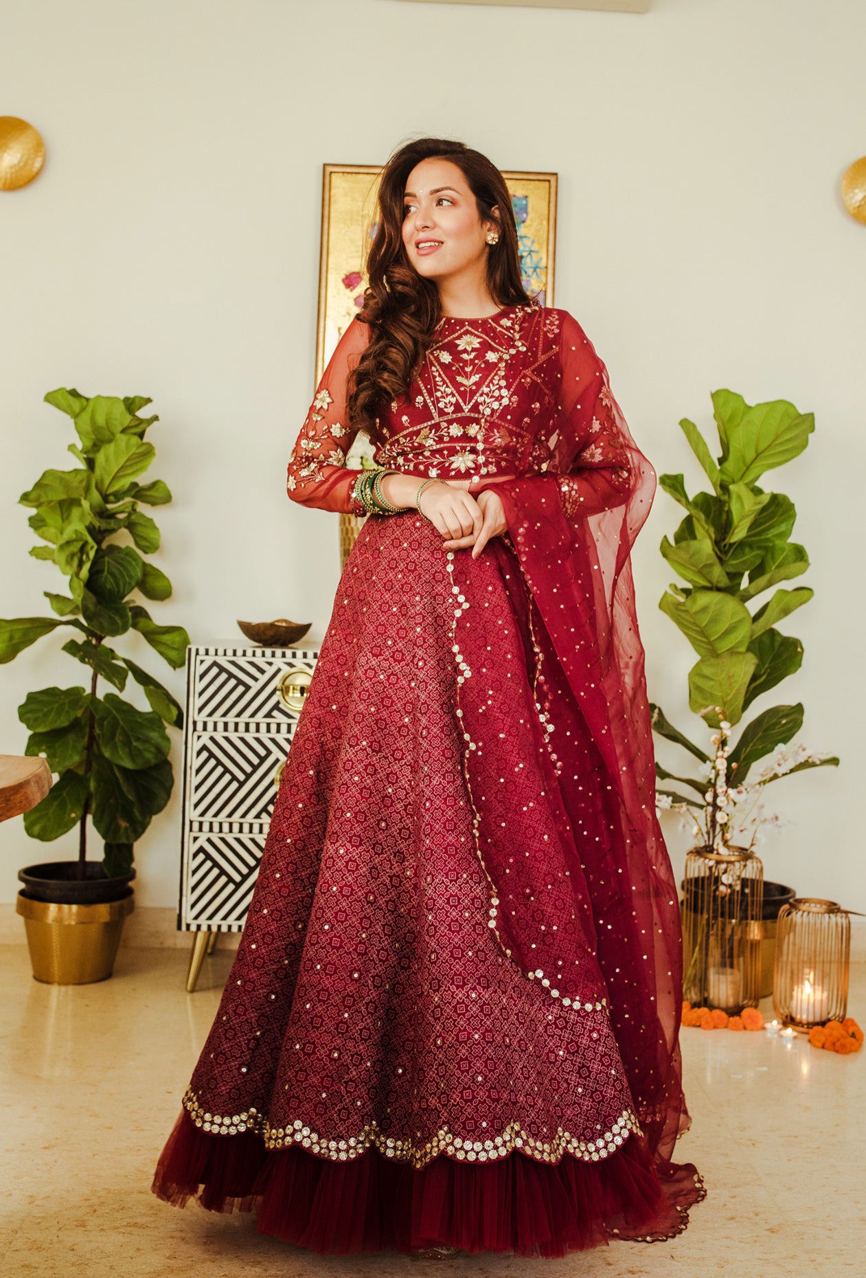 Featuring a plum printed and embroidered lehenga in silk base with scalloped ghera and net frills paired with a matching hand embroidered silk blouse having soft net embroidered full sleeves. It comes with a plum mukaish embroidered silk organza scalloped dupatta.