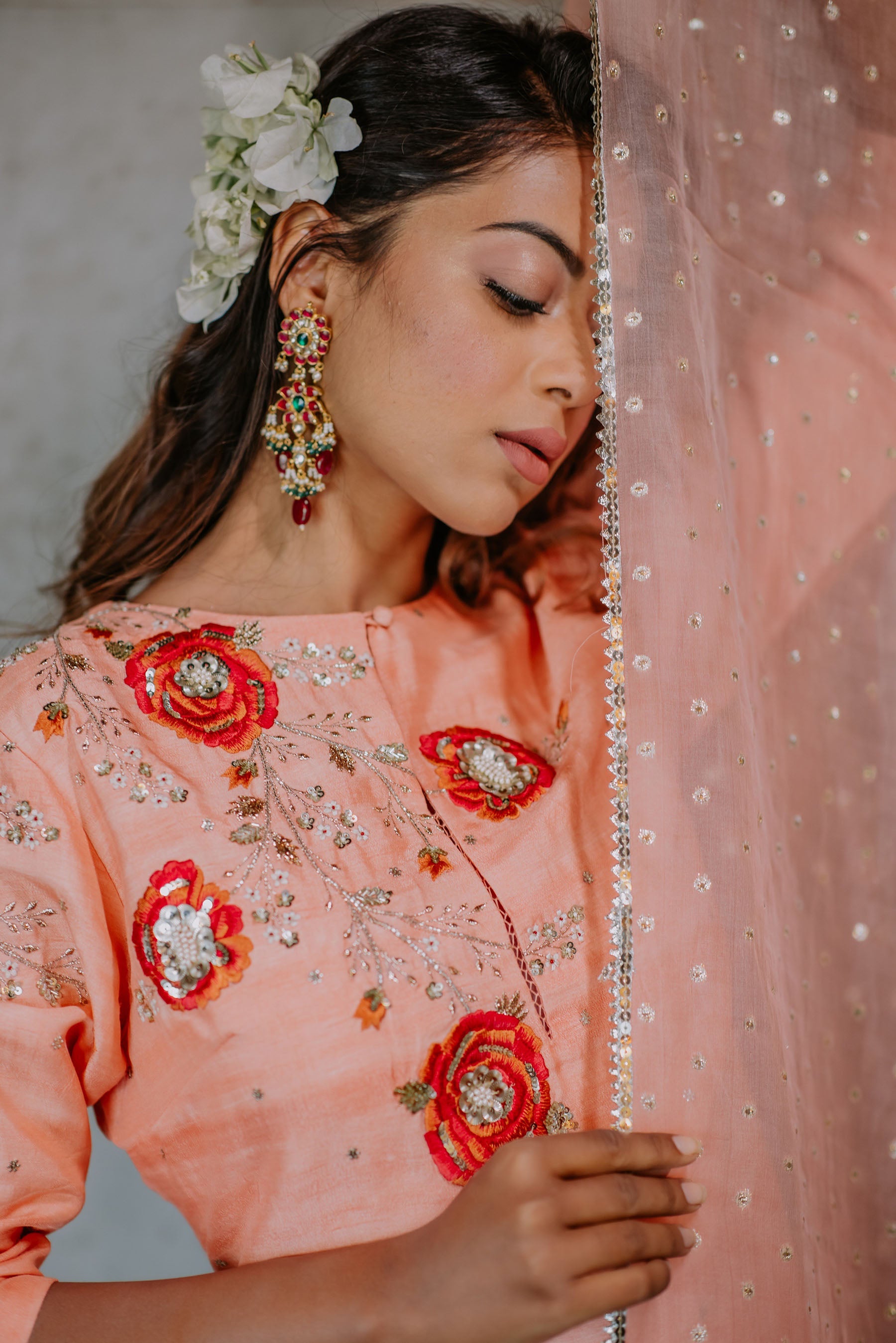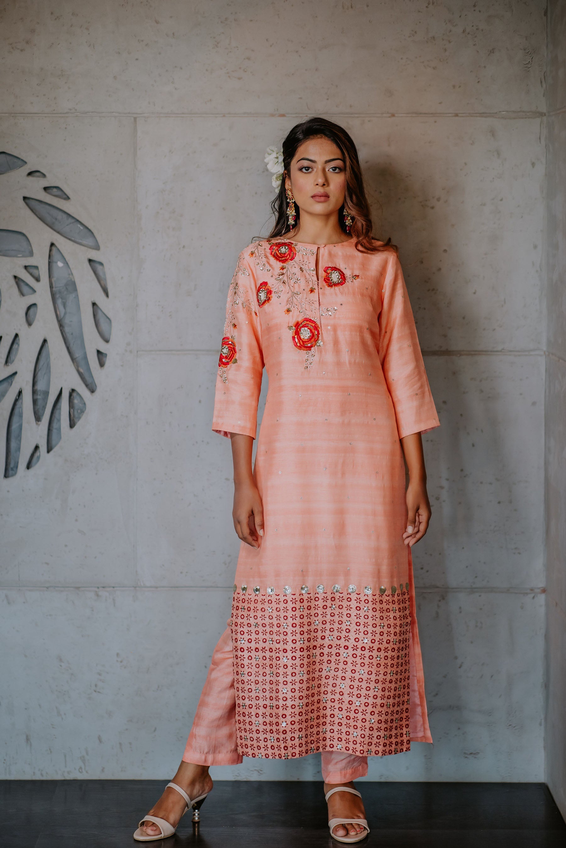Featuring a peach straight kurta in silk base with floral hand embroidery, hand block printed thick border, side slits and keyhole neckline paired with matching narrow silk pants. It comes with a silk organza zari booti dupatta having gota lace edging.